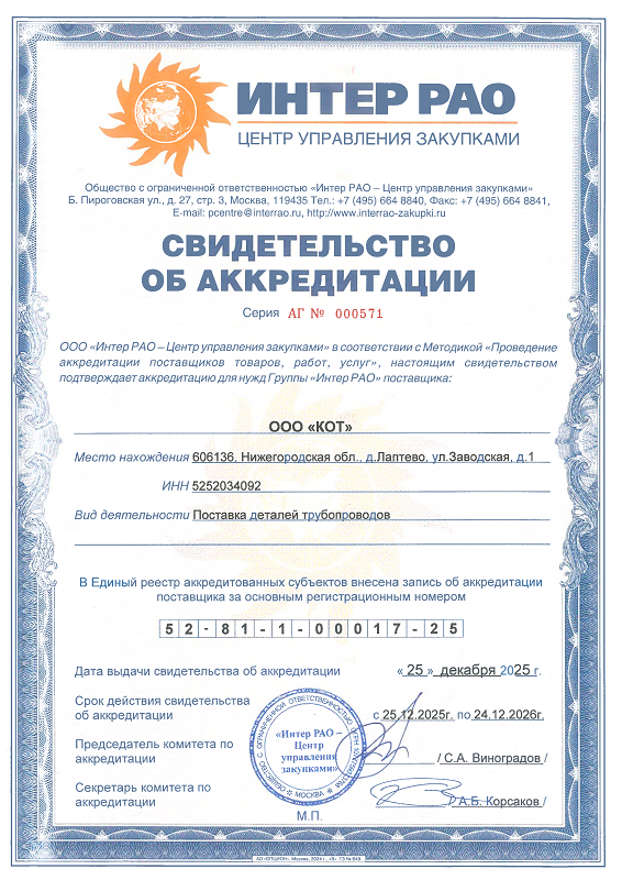 Производственное предприятие ООО "КОТ" успешно прошло ежегодную процедуру аккредитации и подтвердило свой статус поставщика деталей трубопроводов для нужд Группы "Интер РАО". Соответствующее свидетельство об аккредитации было выдано 25 декабря 2025 года и будет действовать до 24 декабря 2026 года.