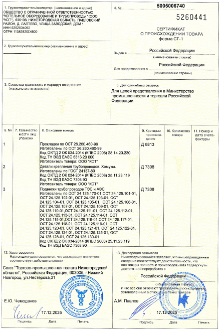 ООО «КОТ» сообщает о получении нового сертификата происхождения товара по форме СТ-1. Документ подтверждает российское происхождение промышленной продукции и соответствует требованиям Постановления №719.