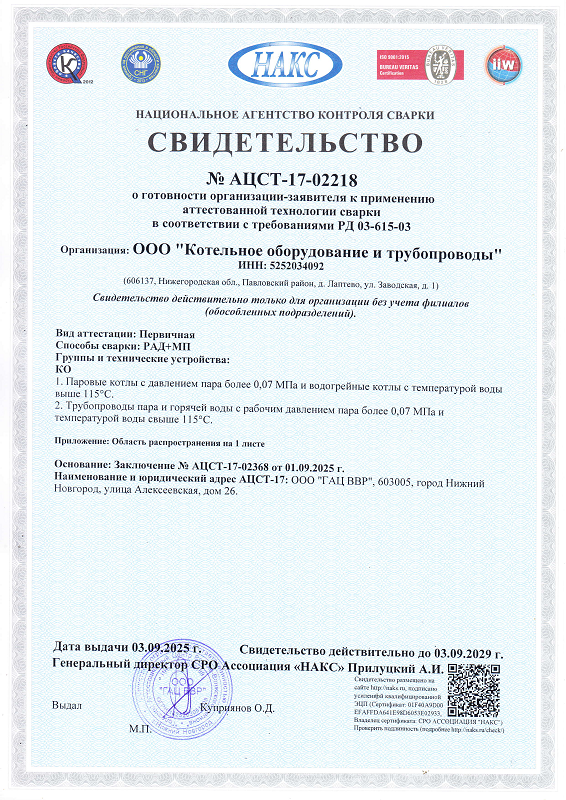 Мы рады сообщить, что наше предприятие — ООО «Котельное оборудование и трубопроводы» — успешно прошло процедуру первичной аттестации в Национальном агентстве контроля сварки (НАКС) и получило Свидетельство № АЦСТ-17-02218.